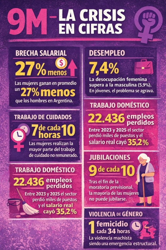 Cuando hay crisis, las que ponen el cuerpo son las mujeres. Estamos en la primera línea. Este 2026, se decidió convocar a paro y movilización el 9 de marzo en continuidad con las ya históricas movilizaciones antifascistas realizadas desde que Milei gobierna la Argentina. El 8 de marzo también se marchó y se movilizó en varias ciudades del país. El objetivo transversal es la unión de todas las luchas contra el saqueo. Otra vez en la historia, las mujeres y las diversidades se organizan para enfrentar las políticas de destrucción de lo común. Paro y movilización para interrumpir la normalización del saqueo y el disciplinamiento. Paro y movilización contra el ajuste, el programa de hambre, la represión, la reforma laboral, el saqueo al salario, la violencia, el colonialismo y el endeudamiento en beneficio de un capital cada vez más concentrado.
