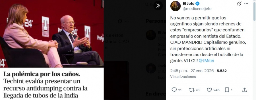 Por su parte, el mismo 27 de enero, el presidente Javier Milei decidió calificar a Rocca como “Don Chatarrín de los Tubitos CAROS”. Y en Mar del Plata, en el cierre del evento libertario, la Derecha Fest, expresó sus críticas contra Rocca, pero sin nombrarlo. “Aquellos que tienen productos más caros y de menor calidad no son dignos del favor del mercado. Y si quieren hacerlo por la fuerza, haciendo negocios turbios con el Estado, esos deben desaparecer e ir a la quiebra”, espetó. Y agregó ensayando una postura anticorrupción: “No son creadores de bienestar, son destructores de la sociedad. Perjudican a millones para llevarse sus coimas frente a los políticos”.