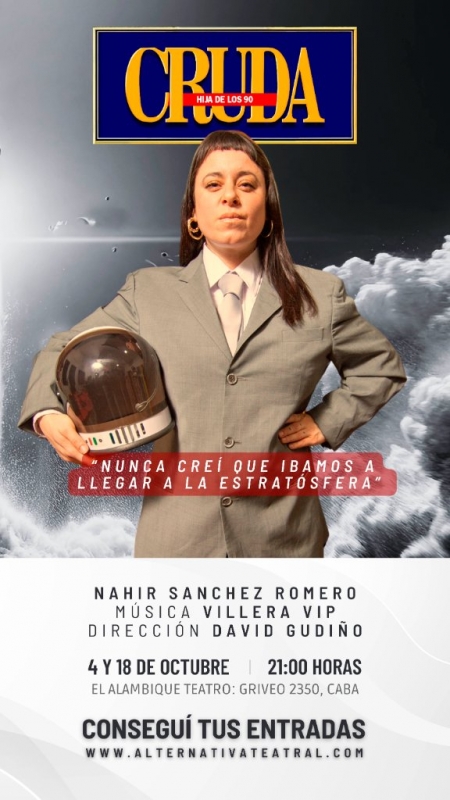 “Cruda. Hija de los ‘90” es la historia de una viajera en el espacio que se dirige hacia la estratósfera prometida y es captada por marcianos. A través de un interrogatorio contará sin inflación su década del uno a uno. Entre canciones desgarradas y coloridas, ropa de feria y altares de santos infinitos, expondrá a los seres verdes su herida abierta. Kranear dialogó con la autora Nahir Sánchez Romero sobre el origen de la obra y el contexto en el que surgió.