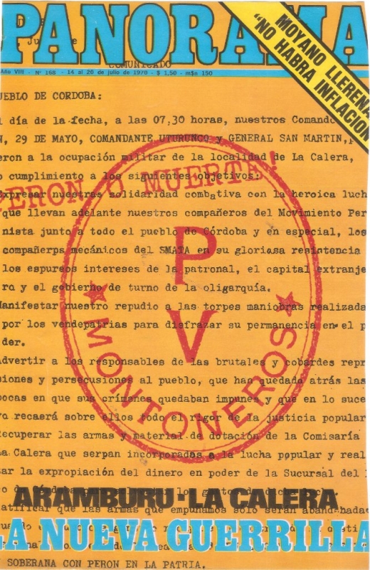 “La Toma de La Calera fue un operativo realizado por la organización guerrillera peronista Montoneros el 1 de julio de 1970, a las 07:30 de la mañana, en la localidad cordobesa de La Calera. Tomaron la comisaría, se asaltó el Banco de la Provincia de Córdoba, se tomó la central telefónica y se inutilizaron sus equipos y se dejó en la esquina del banco una caja -un supuesto explosivo- que en realidad contenía un grabador con la Marcha Peronista.