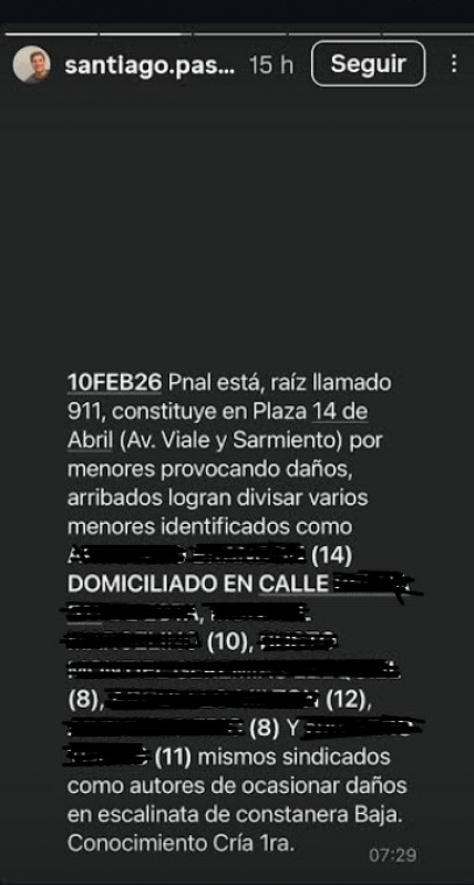En la búsqueda de posicionamiento, en ese intento de superarse y competir con la agenda de la ultra derecha nacional que no tiene límites, desde su cuenta en Instagram, el intendente de San Nicolás, Santiago Passaglia, en su estado, publicó los nombres y apellidos de los 6 niños, acusados de ser los responsables, marcando el domicilio de uno de ellos. Un colega me informó que Passaglia había publicado su identidad y me consultó al respecto. Alertado de tal brutalidad fui a comprobar si efectivamente el intendente no había resguardado a los niños. Ingresando en su cuenta pública de Instagram lo constaté. Realicé captura de imagen que aquí se ofrece, reservando nombre y apellido de los niños como marca la ley, a los que Passaglia dañó.