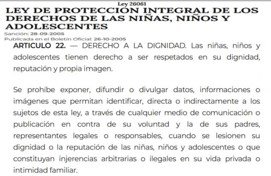 Santiago Passaglia violó el artículo 22 de la ley (26.061) de protección integral de Derechos de Niñas, Niños y Adolescentes. También violó el artículo 1.770 del Código Civil y Comercial que protege la intimidad y vida privada, que establece quien difunde generando daño debe repararlo.