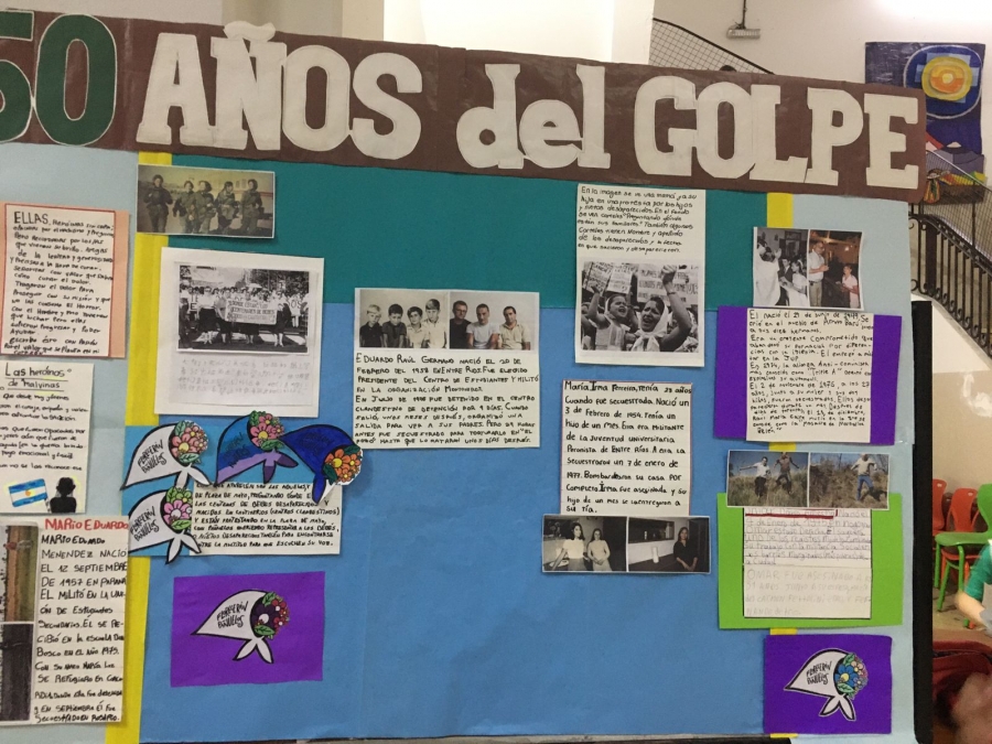 La charla, pautada entre el colegio y la agrupación H.I.J.O.S. a principio de marzo, con motivo de los cincuenta años del golpe genocida de 1976, se enmarcaba en el trabajo que venía realizando la docente de Ciencias Sociales. Yo estaba solo –porque eran muchas las charlas y había que repartirse y garantizar la mayor cantidad posible de coberturas-, y tuve que apelar al “testimonio”, figura que entre los hijos e hijas se utiliza para referirse a nuestra historia trágica –aunque colectiva-, porque nunca falla: los oyentes, en este caso pibes y pibas entre catorce y diecisiete años, abren los ojos como dos platos, prestan atención, y hasta se sensibilizan con nuestra historia, y con uno, que sos carne y sos hueso, ahí sentado frente a ellos, en su aula, en su patio, en su escuela, en su segunda casa.