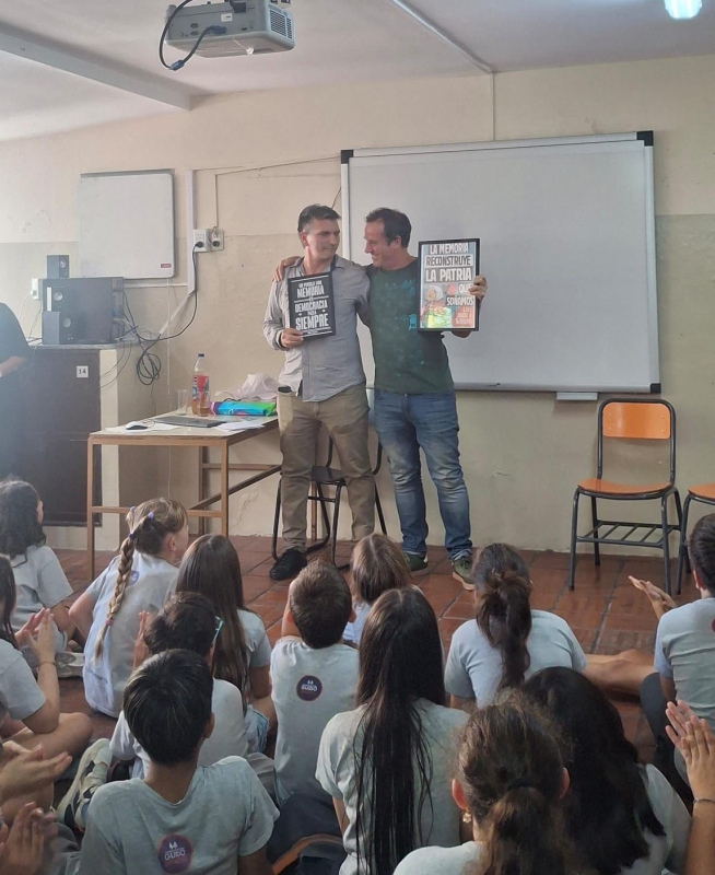 Este año, la convocatoria de parte de los docentes y directivos a H.I.J.O.S., creció de manera exponencial, por el peso que tienen los cincuenta años, por el negacionismo explícito del gobierno, y también por el hastío que hay con los hermanos Milei y sus socios, y entonces desde la agrupación convocaron a sumar fuerzas, ya que tal como pasó en el tiempo de impunidad de la década del 90, se tornó necesario ir a los establecimientos educativos, junto a los docentes, a hablar del 24 de marzo, el genocidio, los desaparecidos, la identidad y el Nunca Más.